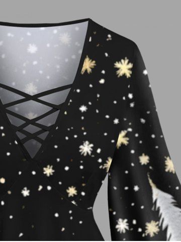 Plus Size Christmas Tree Snowflake Elk Print Lattice Long Sleeves Women T-shirt - Black - M