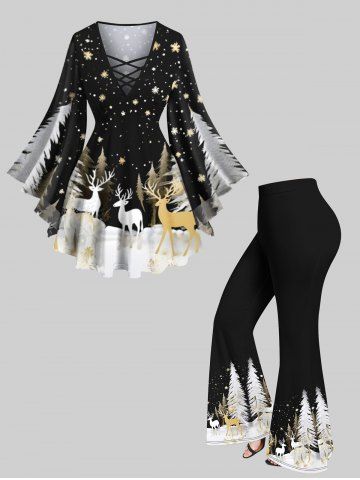 Plus Size Christmas Tree Snowflake Elk Print Lattice Long Sleeves Women T-shirt - Black - 6x