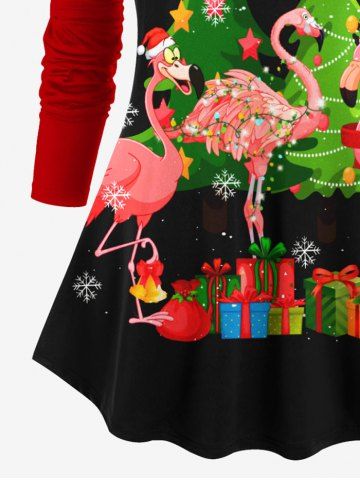 Plus Size Christmas Tree Snowflake Gift Flamingo Print Long Sleeves Women T-shirt - Black - 1x