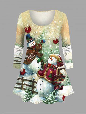 Plus Size Christmas Tree Snowman Snowflake Bird Print T-shirt - Beige - Xs