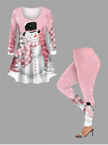 Plus Size Christmas Tree Snowman Snowflake Plaid Print T-shirt - Light Pink - L