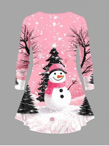 Plus Size Christmas Tree Snowman Snowflake Print Long Sleeves T-shirt - Light Pink - S