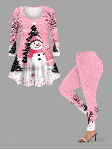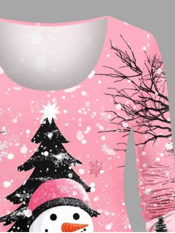 Plus Size Christmas Tree Snowman Snowflake Print Long Sleeves T-shirt - Light Pink - 2x