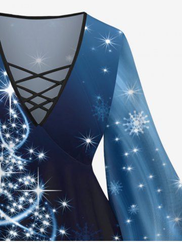 Plus Size Christmas Tree Star Glitter 3D Print Lattice Crisscross Flare Sleeve T-shirt - Blue - M