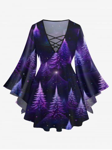 Plus Size Christmas Tree Star Glitter Light Beam 3D Print Lattice Crisscross Flare Sleeve T-shirt - Multi-a - 1x