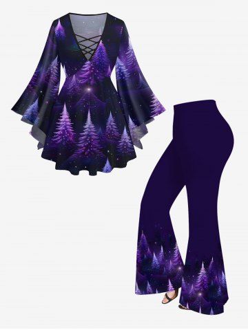 Plus Size Christmas Tree Star Glitter Light Beam 3D Print Lattice Crisscross Flare Sleeve T-shirt - Multi-a - 4x