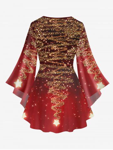 Plus Size Christmas Tree Star Glitter Sparkling Sequin 3D Print Lattice Crisscross Flare Sleeve T-shirt - Deep Red - M