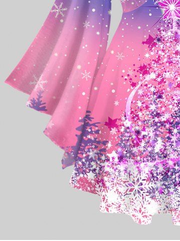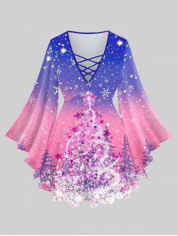 Plus Size Christmas Tree Star Snowflake Ombre Glitter 3D Print Lattice Crisscross Bell Sleeves T-shirt - Light Pink - 5x