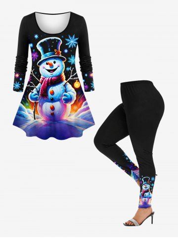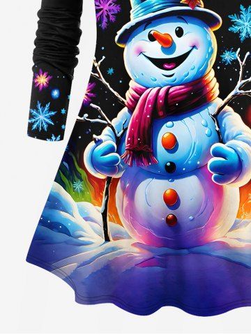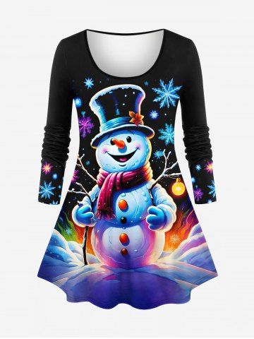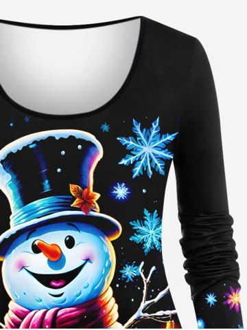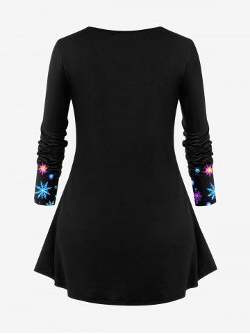 Plus Size Colorful Christmas Snowflake Snowman Print Long Sleeves T-shirt - Black - L