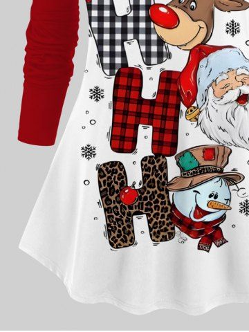 Plus Size Elk Santa Claus Snowman Leopard Plaid Letter Print Christmas Long Sleeves T-shirt - Red - S