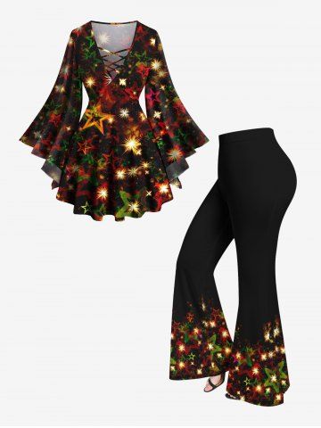 Plus Size Glitter Christmas Light Ombre Stars Print Lattice Long Sleeves T-shirt - Black - L