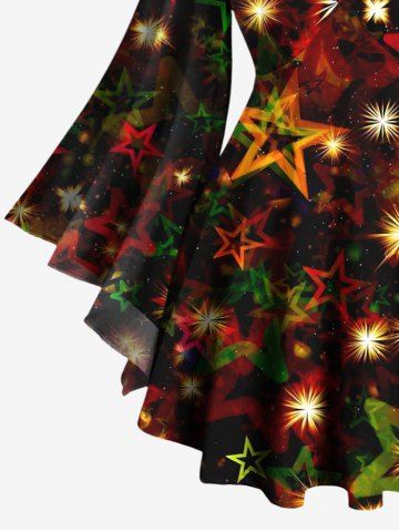 Plus Size Glitter Christmas Light Ombre Stars Print Lattice Long Sleeves T-shirt - Black - 5x