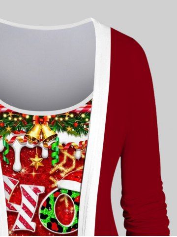 Plus Size Glitter Christmas Wreath Bell Snowflake Letters Candy Contrast Piping Print 2 in 1 Patchwork Long Sleeves T-shirt - Deep Red - L