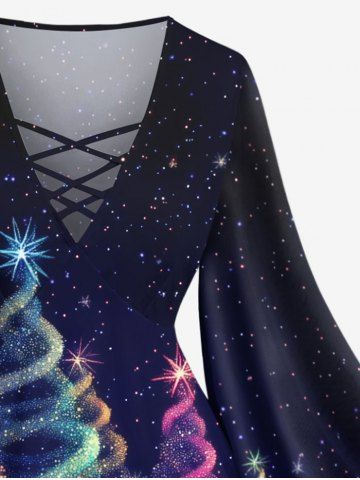 Plus Size Glitter Ombre Christmas Tree Galaxy Print Lattice Long Sleeves T-shirt - Black - 2x