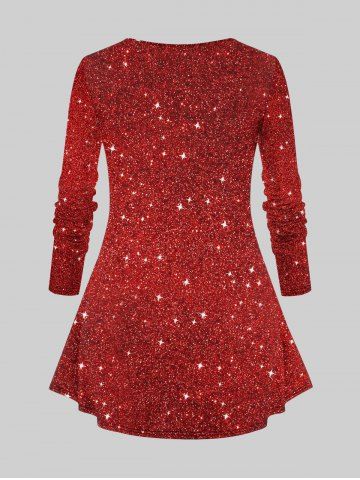 Plus Size Glitter Sparkling Christmas Hat Bear Snowflake Gift Box Sequins Print Long Sleeves T-shirt - Red - Xs