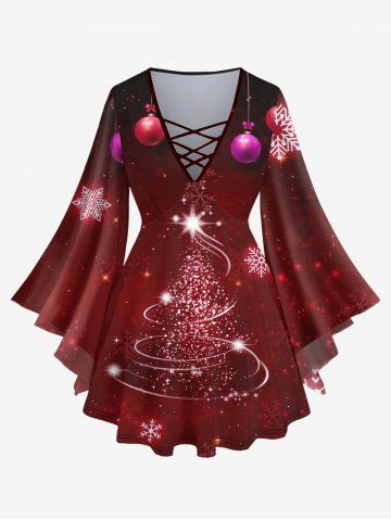 Plus Size Glitter Sparkling Christmas Tree Ball Snowflake Galaxy Print Ombre Lattice Flare Sleeves Top - Deep Red - M