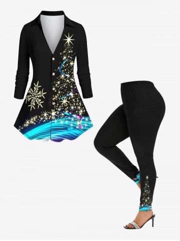 Plus Size Glitter Sparkling Christmas Tree Snowflake Light Beam Print Button Long Sleeves Shirt - Black - Xs
