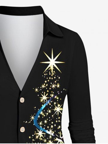 Plus Size Glitter Sparkling Christmas Tree Snowflake Light Beam Print Button Long Sleeves Shirt - Black - 5x
