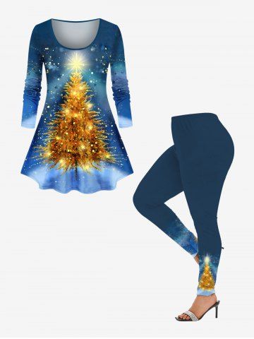 Plus Size Glitter Sparkling Christmas Tree Tie Dye Ombre Galaxy Print Long Sleeves T-shirt - Blue - L