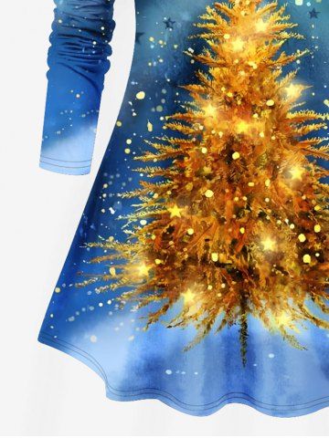 Plus Size Glitter Sparkling Christmas Tree Tie Dye Ombre Galaxy Print Long Sleeves T-shirt - Blue - 1x