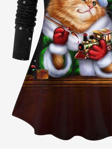 Plus Size Glitter Sparkling Galaxy Snowflake Christmas Hat Cat Print Long Sleeves T-shirt - Black - 2x
