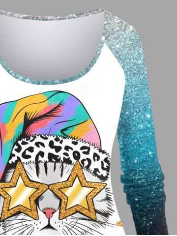 Plus Size Leopard Christmas Hat Star Cat Glitter Ombre Galaxy Print Long Sleeves T-shirt - White - L