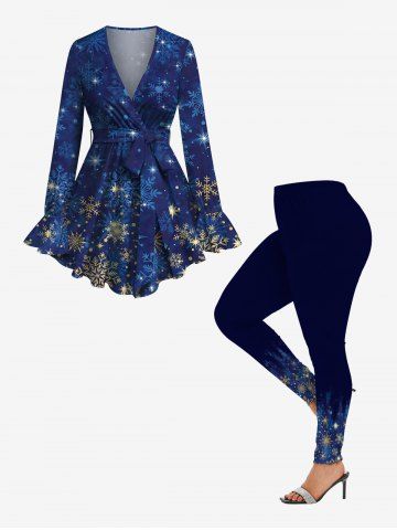 Plus Size Ombre Christmas Snowflake Glitter Stars Galaxy Print Surplice Long Sleeves Blouse with Tied Belt - Blue - S
