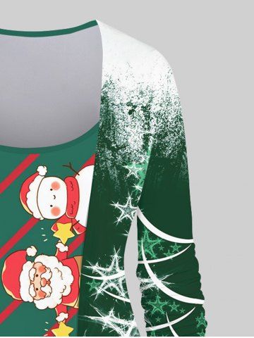 Plus Size Painting Splatter Santa Claus Elk Snowman Glitter Pentagram Striped Print Patchwork 2 in 1 Christmas Long Sleeves T-shirt - Deep Green - M