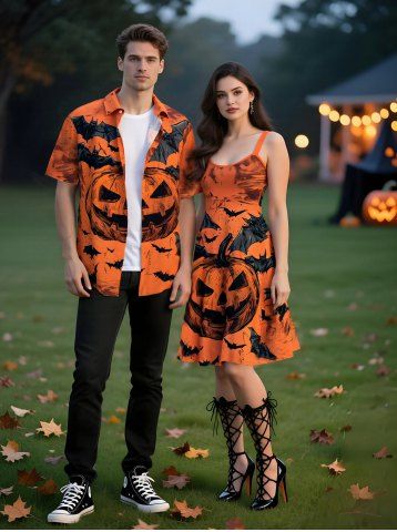 Couple Halloween Outfits > Halloween Pumpkin Bat Print Plus Size Matching Outfit For Couples