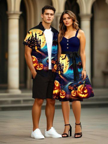 Couple Halloween Outfits > Halloween Pumpkin Lantern Bat Castle Moon Print Plus Size Matching Outfit For Couples
