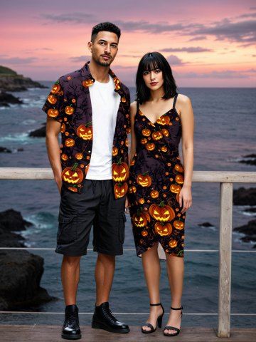 Couple Halloween Outfits > Halloween Pumpkin Lantern Branch Print Plus Size Matching Outfit For Couples