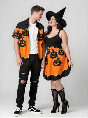 Couple Halloween Outfits > Halloween Pumpkin Tassel Dots Print Plus Size Matching Outfit For Couples