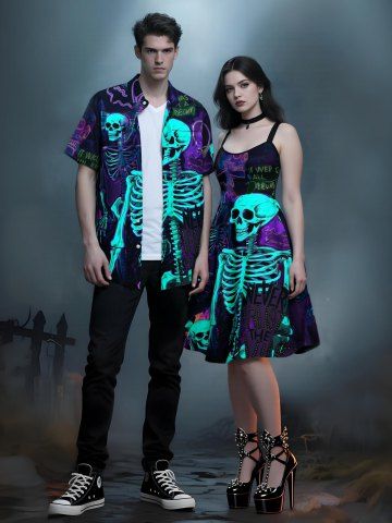 Couple Halloween Outfits > Halloween Skeleton Heart Letters Print Plus Size Matching Outfit For Couples