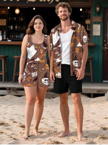 Matching Halloween Shirt and Romper Plus Size Outfit Pumpkin Ghost Skull Flowers Mushroom Print For Couples - Light Brown