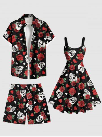 Couple Halloween Outfits > Skull Rose Flower Leaf Heart Print Plus Size Matching Outfit For Couples