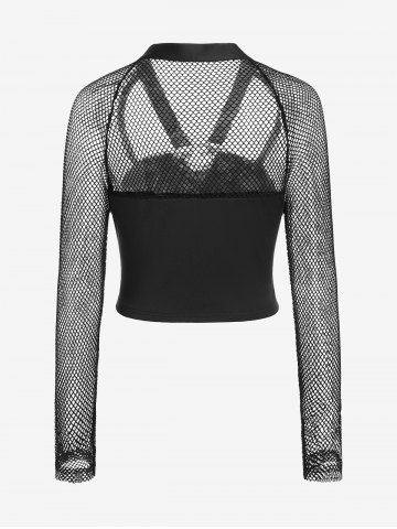 Gothic Sheer Fishnet Cutout Grommets Ring Zip Front Crop Top - Black - 3x | Us 22-24