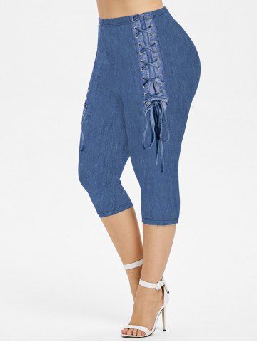 Star Print Lace-up Buttons Lace Trim Hollow Out 2 In 1 Top and Capri Leggings and Pet's Bandana Dog and Owner Matching Outfits - Blue