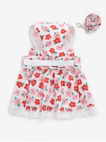 Pet's Flowers Print Bowknot Lace Trim Dress With Leash - Red - M