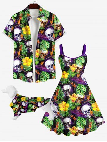Pet's Tropical Leaf Flowers Skulls Print Hawaii Shirt - Black - M