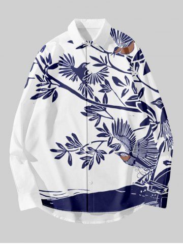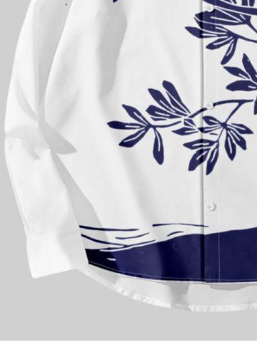 Long Sleeves Shirts > Plus Size Bird Branch Leaf Sea Two Tone Print Hawaii Button Shirt For Men