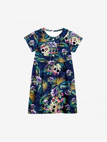 Kid's Coconut Tree Leaf Skull Floral Print Hawaii Button Dress - Blue - 130