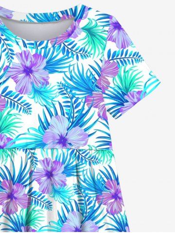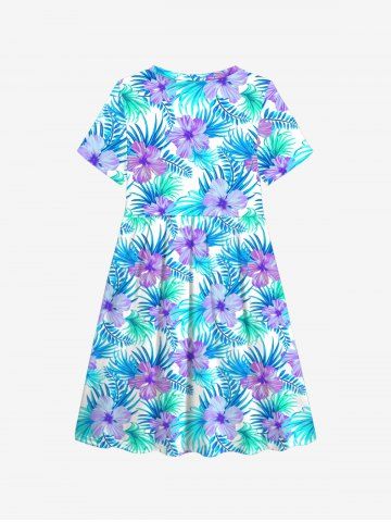 Kid's Flowers Palm Leaf Print Hawaii Dress - Light Blue - 150