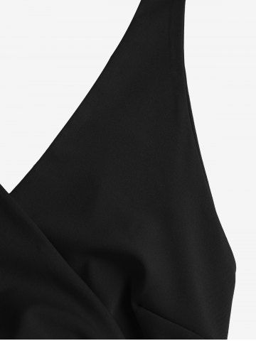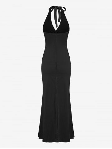 Women's Sexy Elegant Solid Color Ruched Draped Backless Thigh High Split Plunging Neck Halter Tied Prom Evening Gown Maxi Dress - Black - M