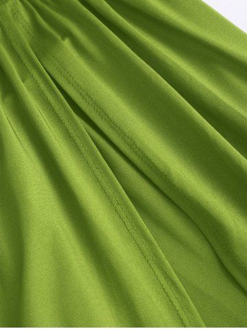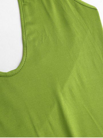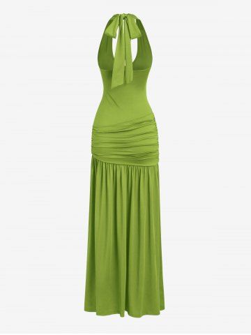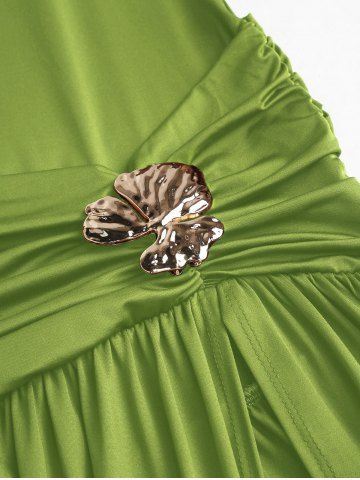 Women's Sexy Slim Fit Ruched Backless Thigh High Slit Floral-shaped Metallic Embellishment Deep U Neck Halter Tied Maxi Pleated Dress - Green - S