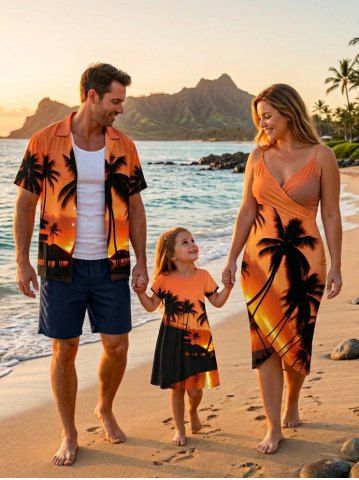Family Outfits > Coconut Tree Ombre Dusk Sunset Print Plus Size Matching Hawaii Beach Outfit For Family