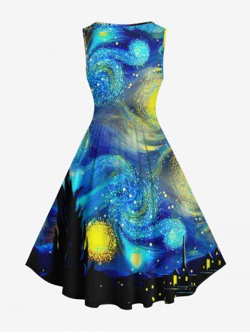P*****r5Plus Size Vintage Glitter Spiral Painting Galaxy Print 1950s Hawaii A Line DressColor: MULTI-A Size: 6XLove it! Mind you the print is a little too blown up on the larger dresses. Still beautiful