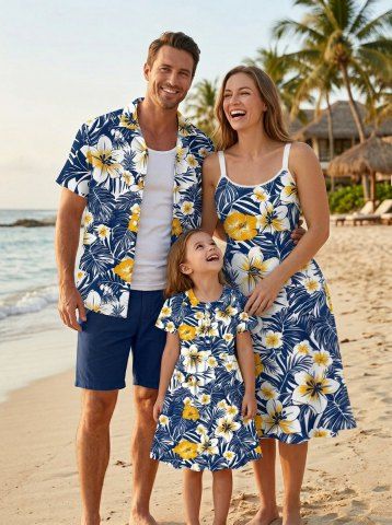 Family Outfits > Tropical Leaf Hibiscus Flower Print Plus Size Matching Hawaii Beach Outfit For Family