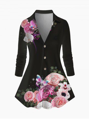 Plus Size Butterfly Flower Printed Long Sleeves Shirt - Black - 4x | Us 26-28
