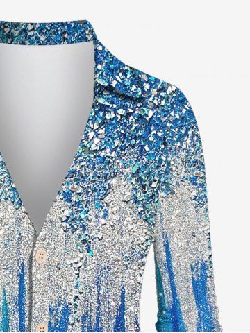 Plus Size Colorblock Sparkling Sequin Glitter 3D Print Buttons Turndown Collar Long Sleeve Shirt - Blue - S