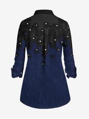 Plus Size Floral Appliques Crystal Denim 3D Print Button Down Shirt - Deep Blue - M